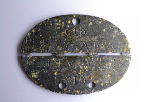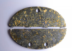 Very nice and rare zinc Erkennungsmarke from a recruit in the 12./SS-Artillerie-Ausbildungs-und-Ersatz-Regiment, which was stationed in Beneschau in Czech Republic. The tag has been broken, but is in very nice condition with the text clearly readible.