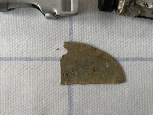The quarter of the id tag (Erkennungsmarke) belonged to an Estonian recruit in SS-Grenadier-Ausbildungs-und-Ersatz-Bataillon 33. The text is still clearly readable.