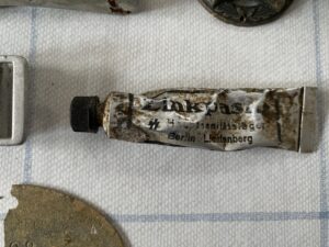 The tube containing Zinkpasta (a disinfection paste) was also found in the same place and is in remarkably good condition, considering it was in the ground for so long.