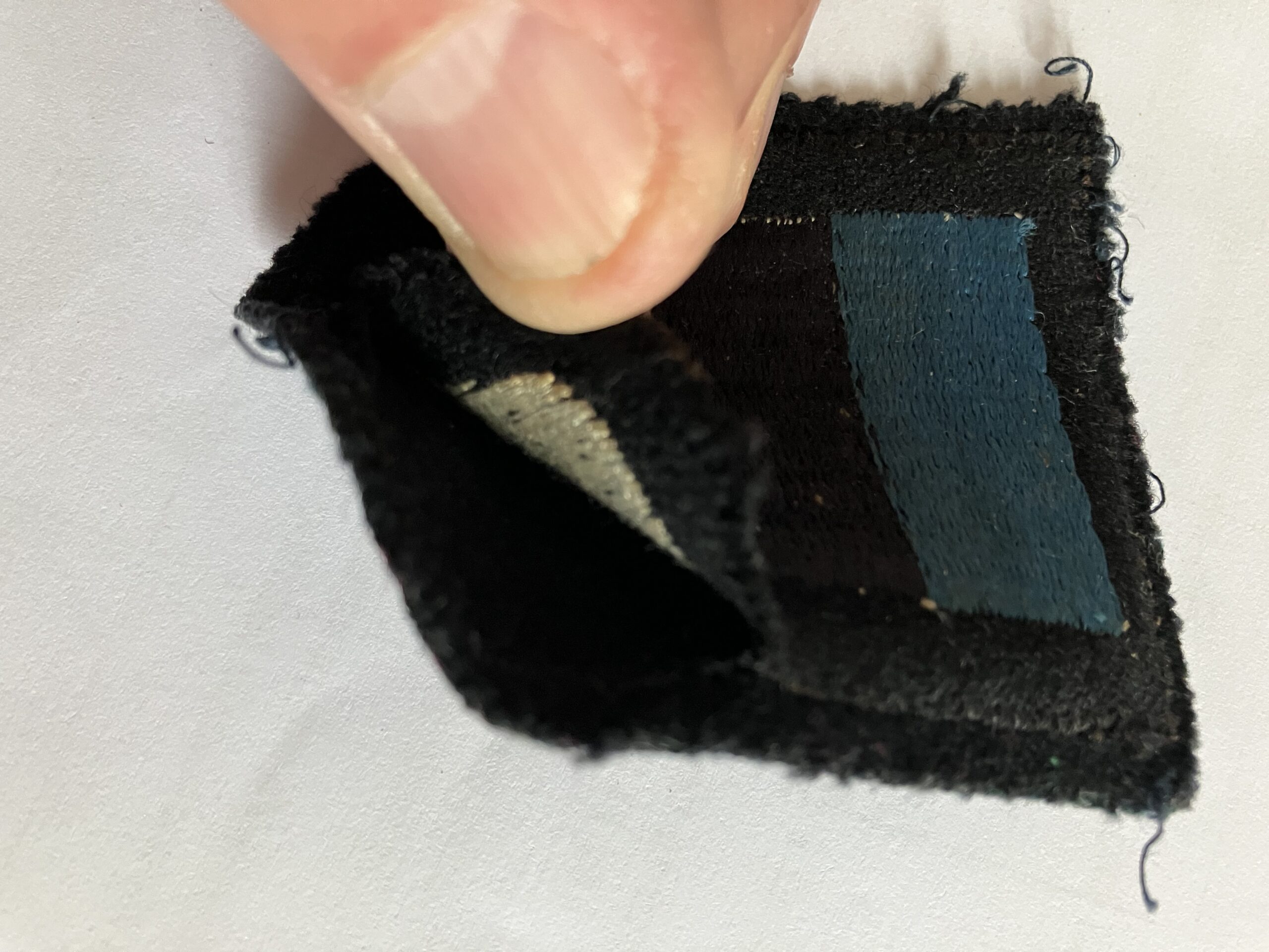 What makes it more interesting is that it is attached to a black piece of cloth. We do not know the purpose of this. The stichting became partly loose in the corner, as can be seen in the pictures. It was found in Finland.