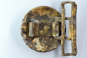 It is made of aluminum with a gold finish, of which the remnants can be seen. The belt buckle has been preserved well, considering it was buried for such a long time. It was in Czech Republic, but we do not know the exact location.