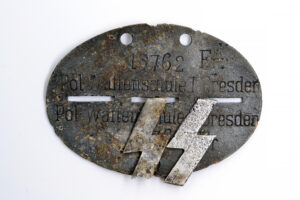 The Polizei-Waffenschule I was located in Dresden-Hellerau. Personnel and students of this school were used to form the 35. SS-Polizei-Grenadier-Division in 1945. The tag is in very nice solid condition with the text clearly readable.