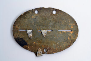 Wonderful and rare zinc Erkennungsmarke from a member of the Polizei-Waffenschule I. The tag was found together with two field-made aluminum runes in Adollfof in Czech Republic and probably thrown away in May 1945.