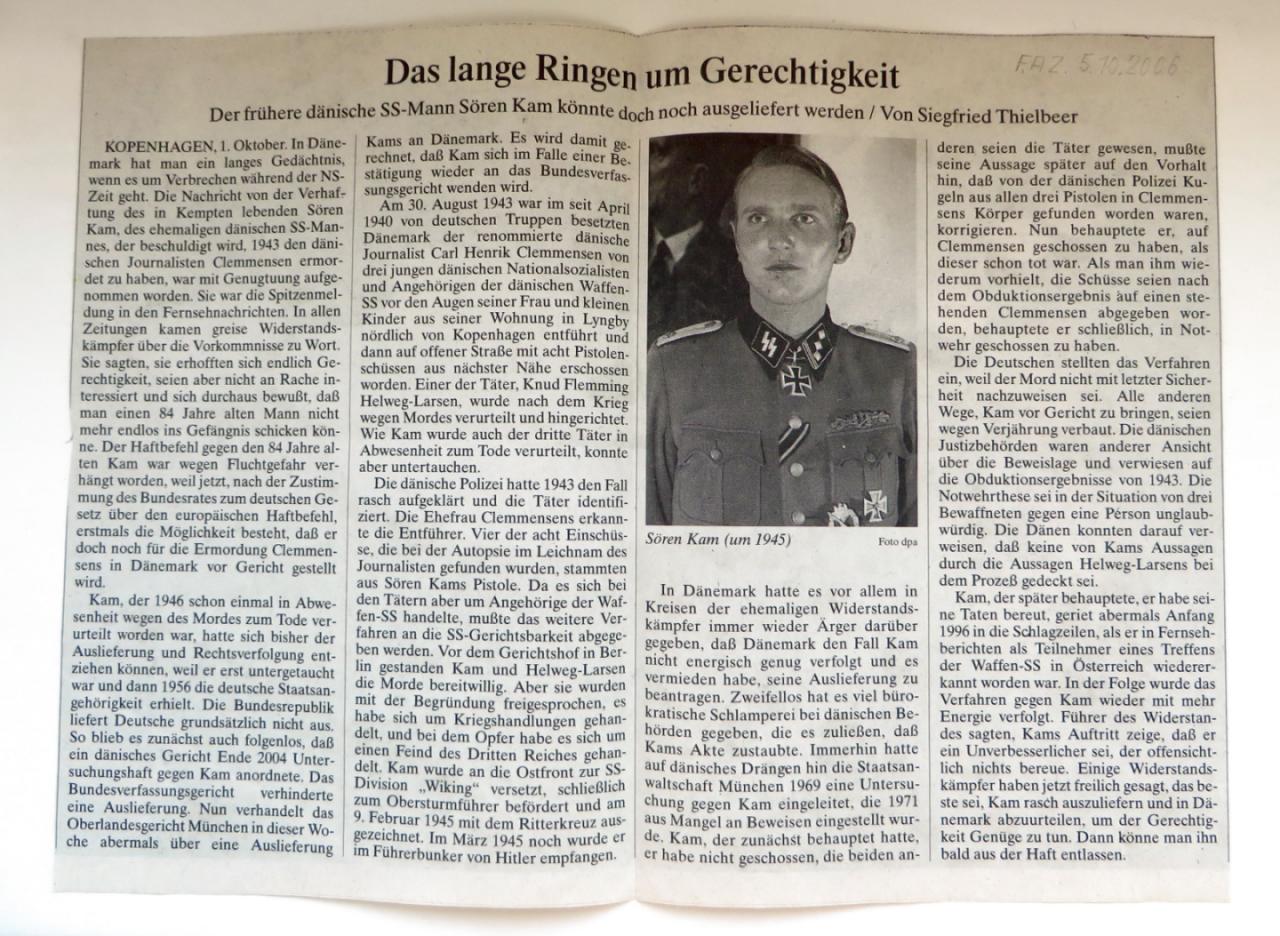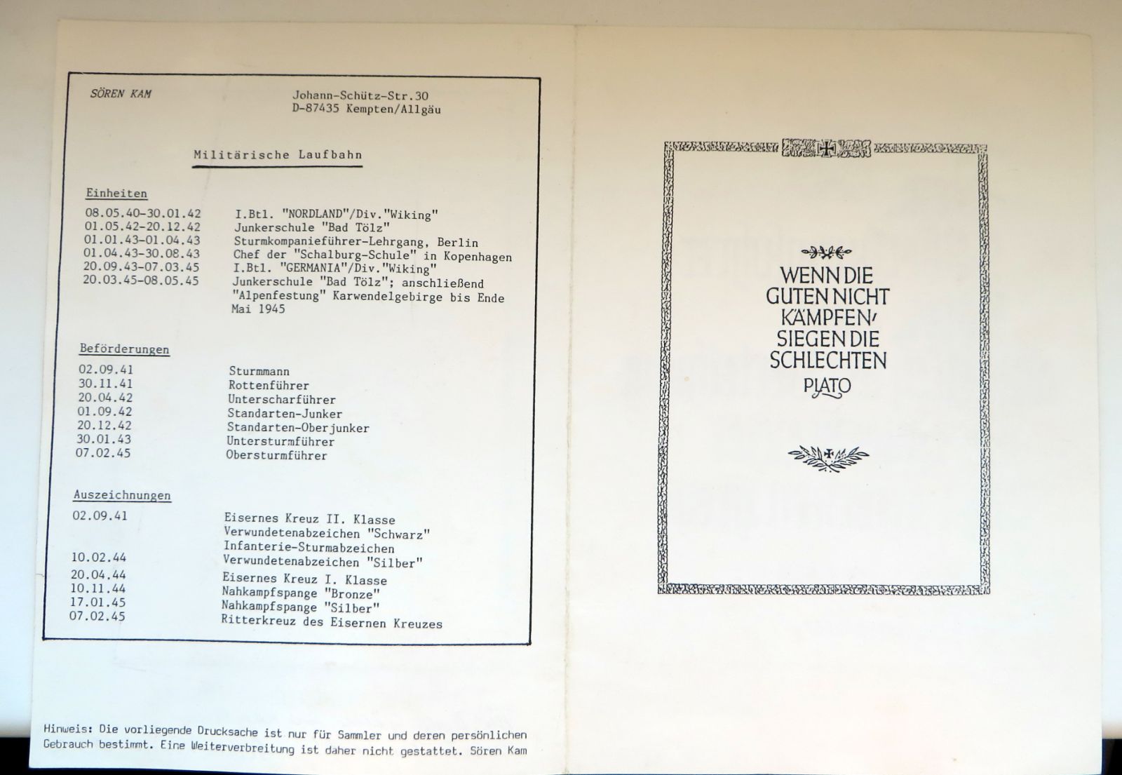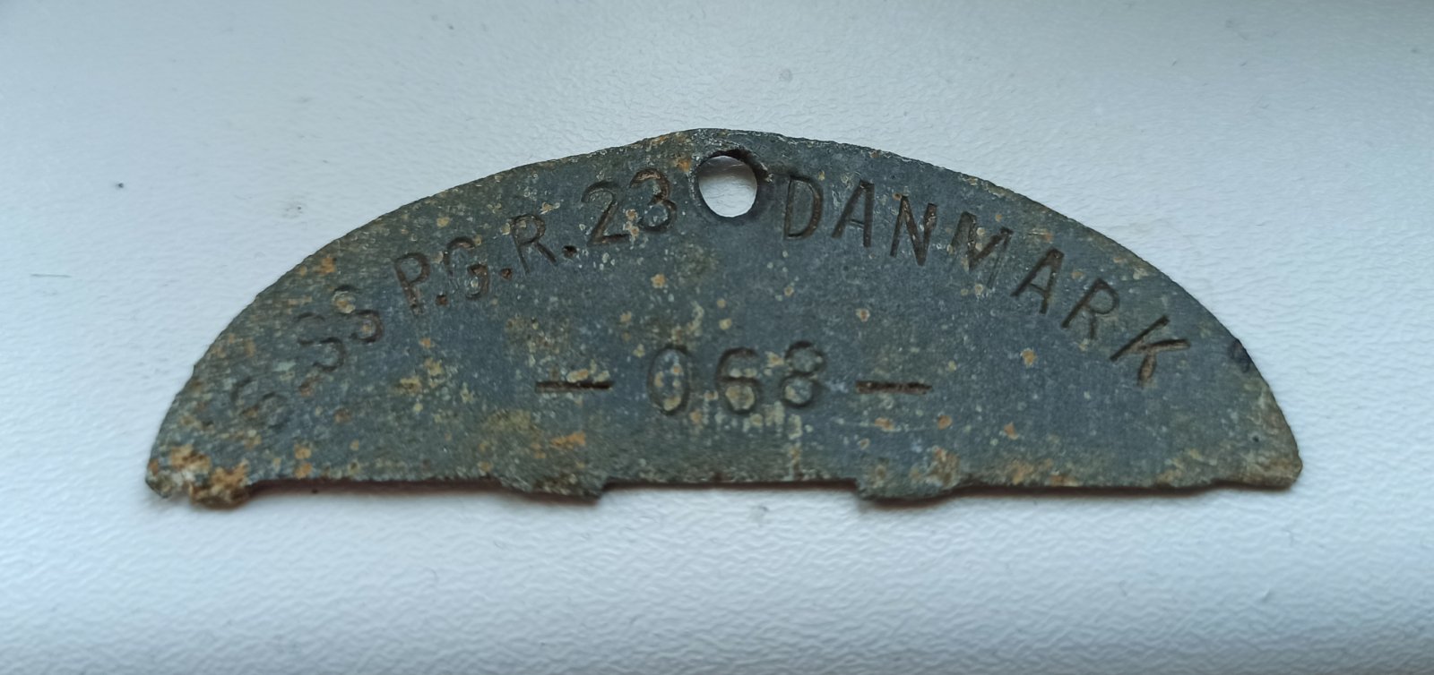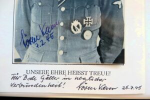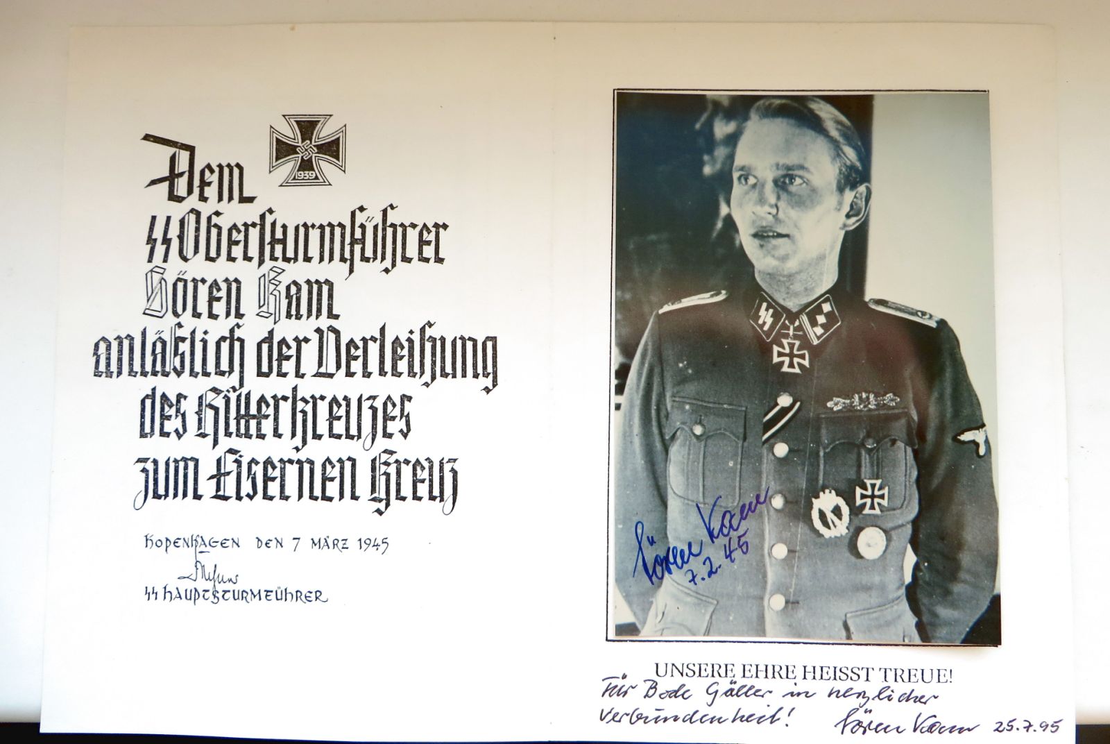 It consists of a half zinc Erkennungsmarke from a member of the 6./SS-Freiwilligen-Panzer-Grenadier-Regiment 24 “Danmark” (a typical feature of these tags is the wrong regimental number 23), a trench-art signal casing from Demyansk, an unissued late-war Danish SS sleeve shield, and a postwar printed photo with the signature of Ritterkreuzträger Sören Kamm.