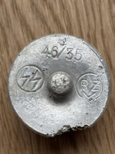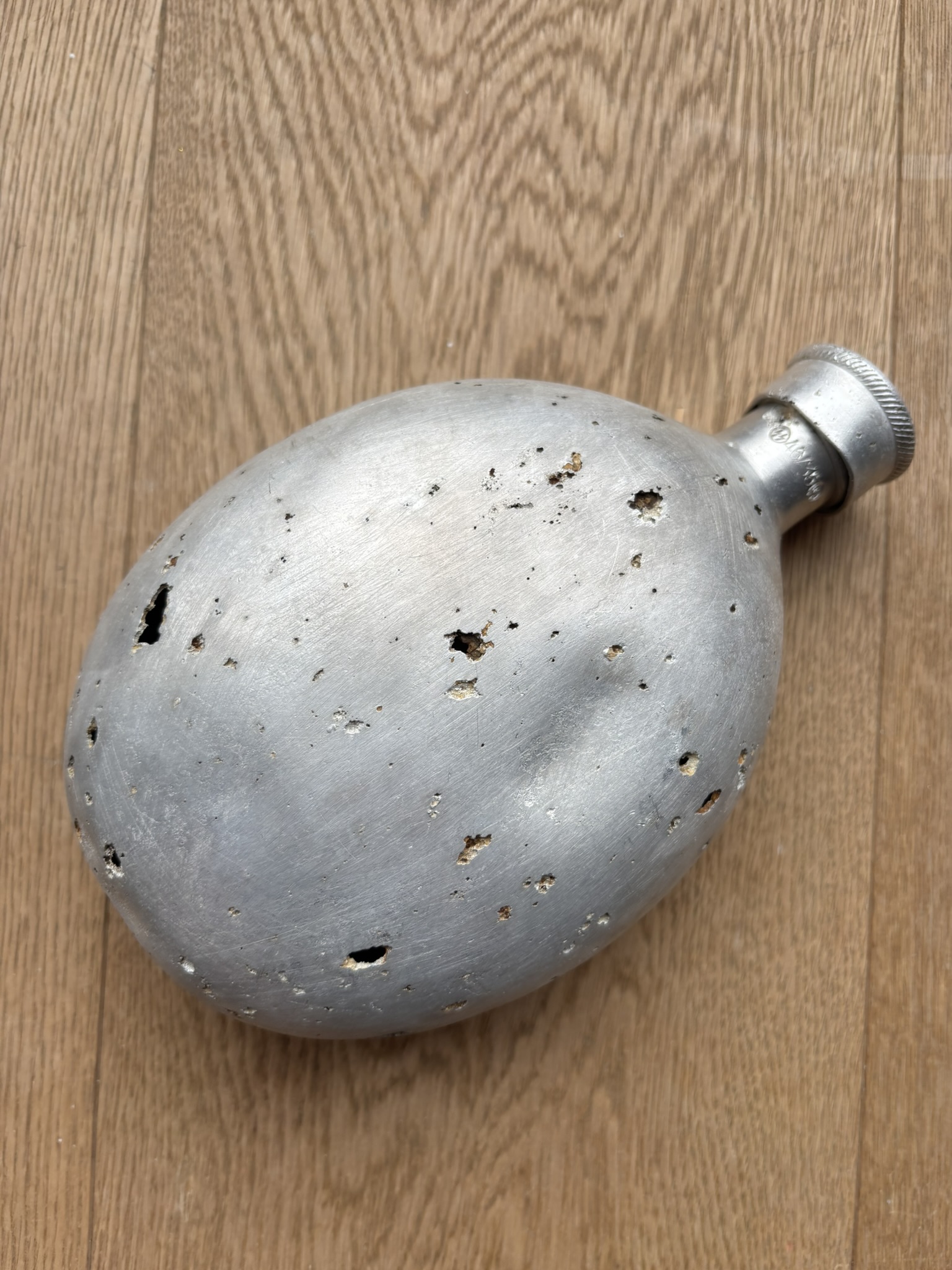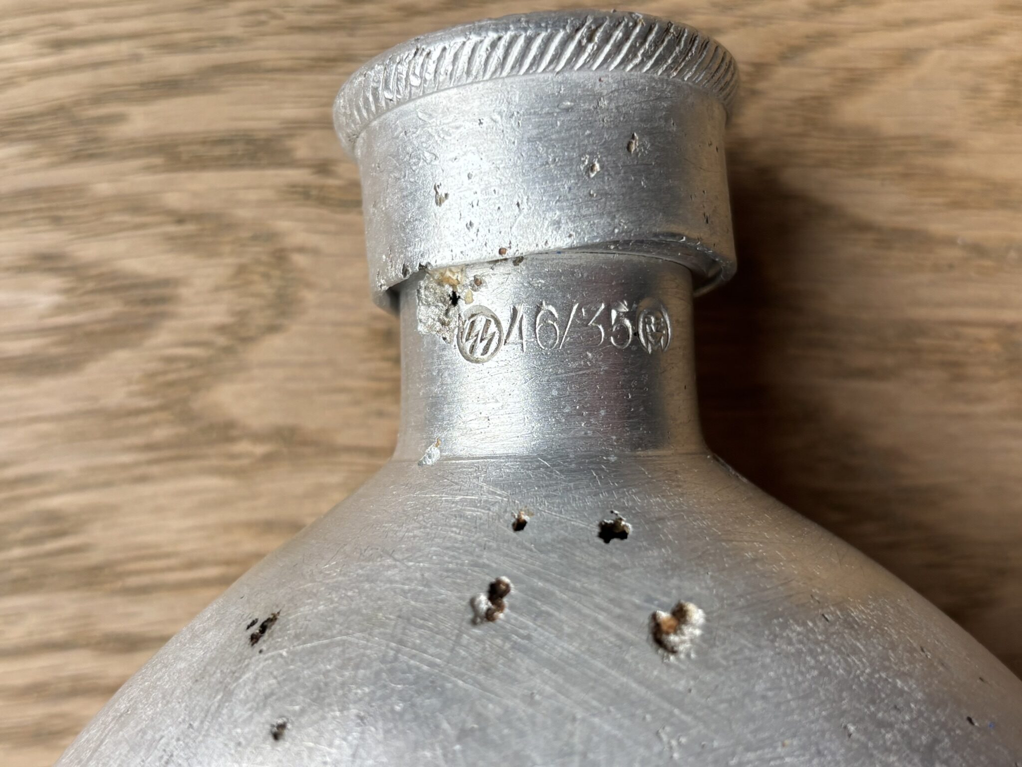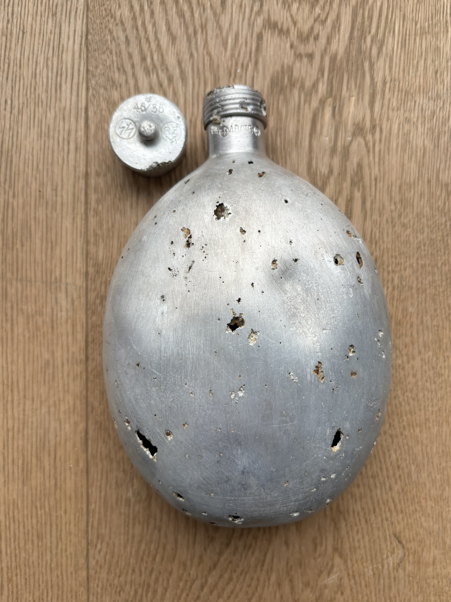 The canteen and cup are in very good condition, considering they are battlefield-found, and is rare to see SS-marked canteens, especially complete with the cup. There is damage from corrosion, but also what looks like to be battle-damage.