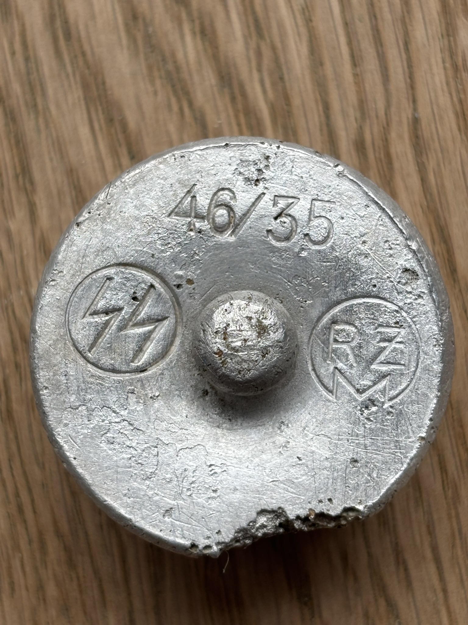 Very nice aluminum canteen, complete with its original cup, both marked SS 46/35 RZM. It was found near Novgorod.