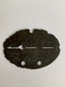 Nice and rare zinc Erkennungsmarke from a member of the Stab/Lettische SS-Freiwilligen-Regiment 5, which was formed in the Spring of 1943 and renamed to SS-Freiwilligen-Grenadier-Regiment 43 (Lett. Nr. 5) in October 1943.