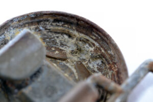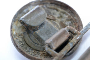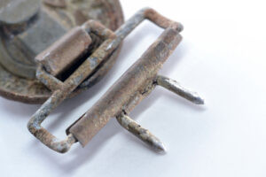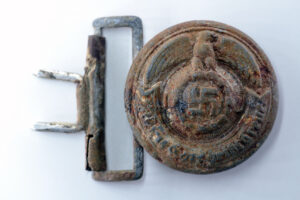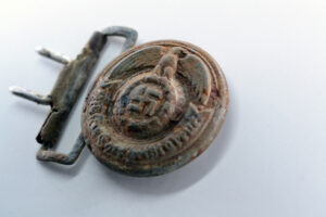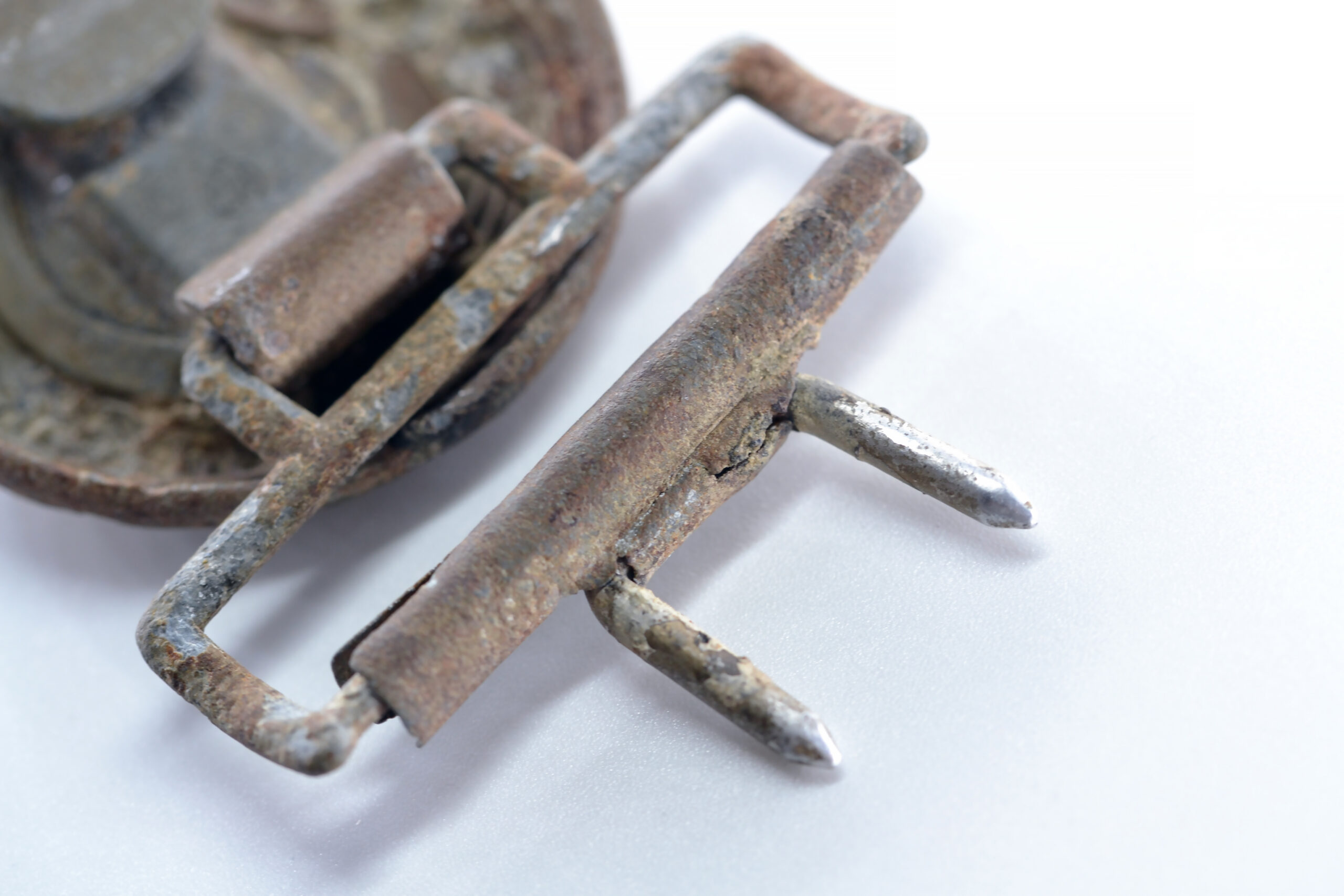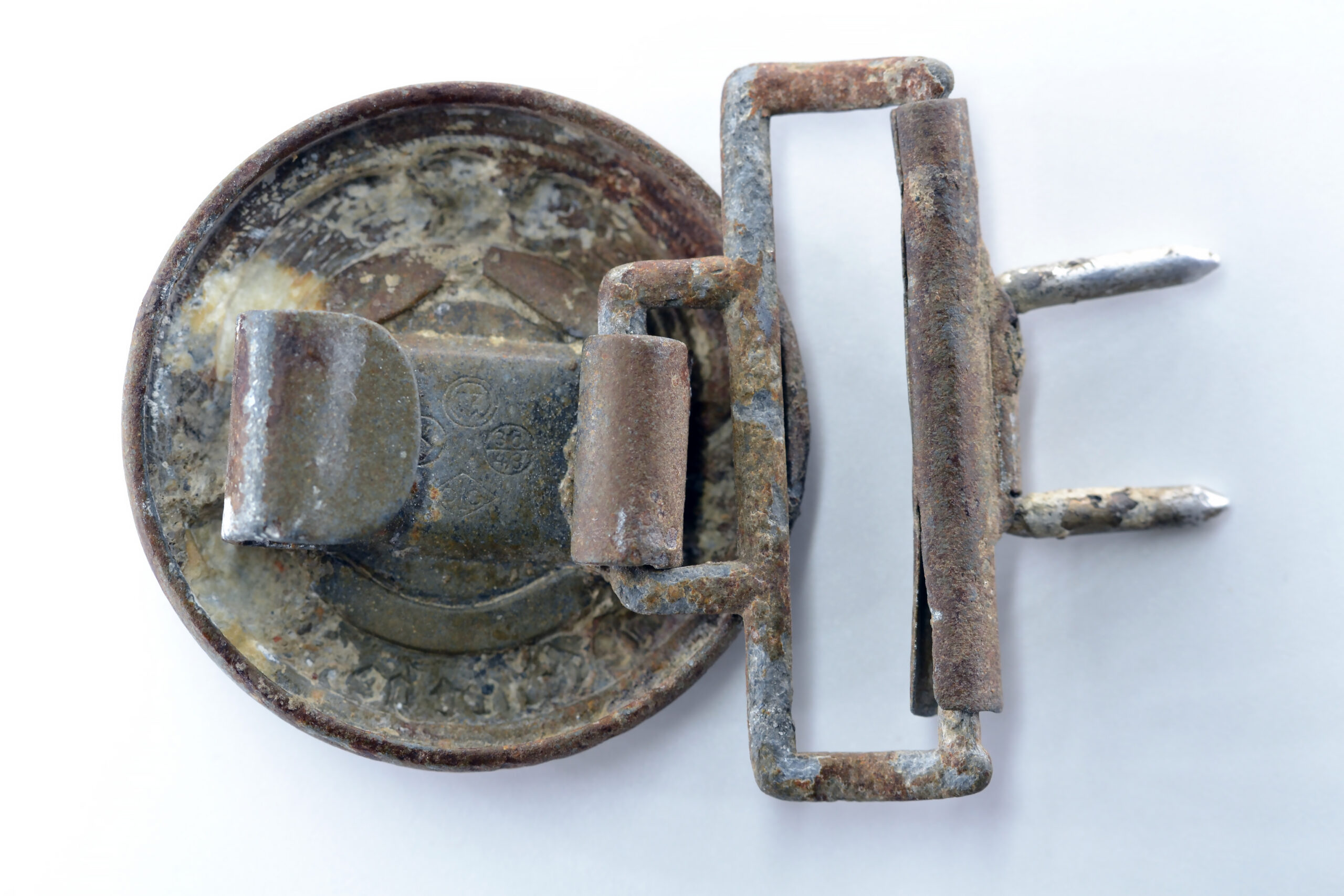 A nice and attractive battlefield-found mid-war zinc/steel SS officer's belt buckle. It is marked SS RZM 36/43, indicating the maker as Overhoff & Cie from Lüdenscheid.