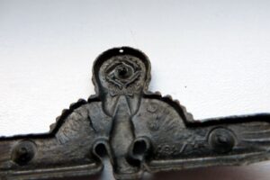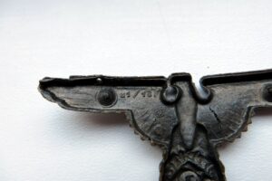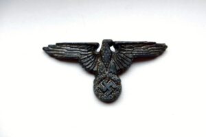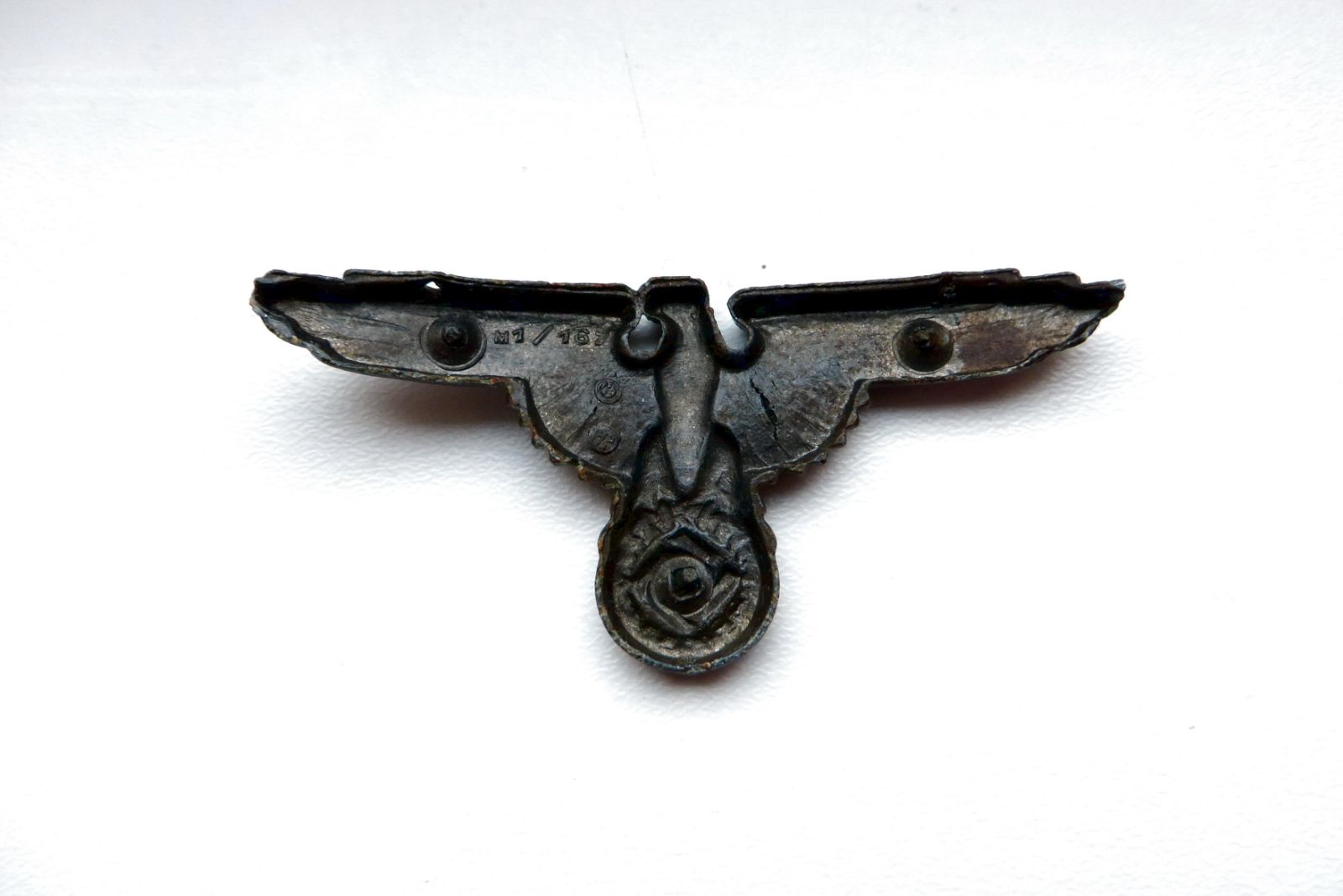 Really nice and rare zinc Waffen-SS visor cap eagle, marked RZM 1/67, indicating it was made by Augustin Hicke.