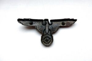 The eagle was found in Germany, in the Harz Mountains. Until April 27, 1945, approximately 100,000 German soldiers of all branches ended up there. The owner carefully drilled three holes in the eagle for sewing it onto his cap, bent it a bit to give it a better look, and might have removed the prongs for that reason.