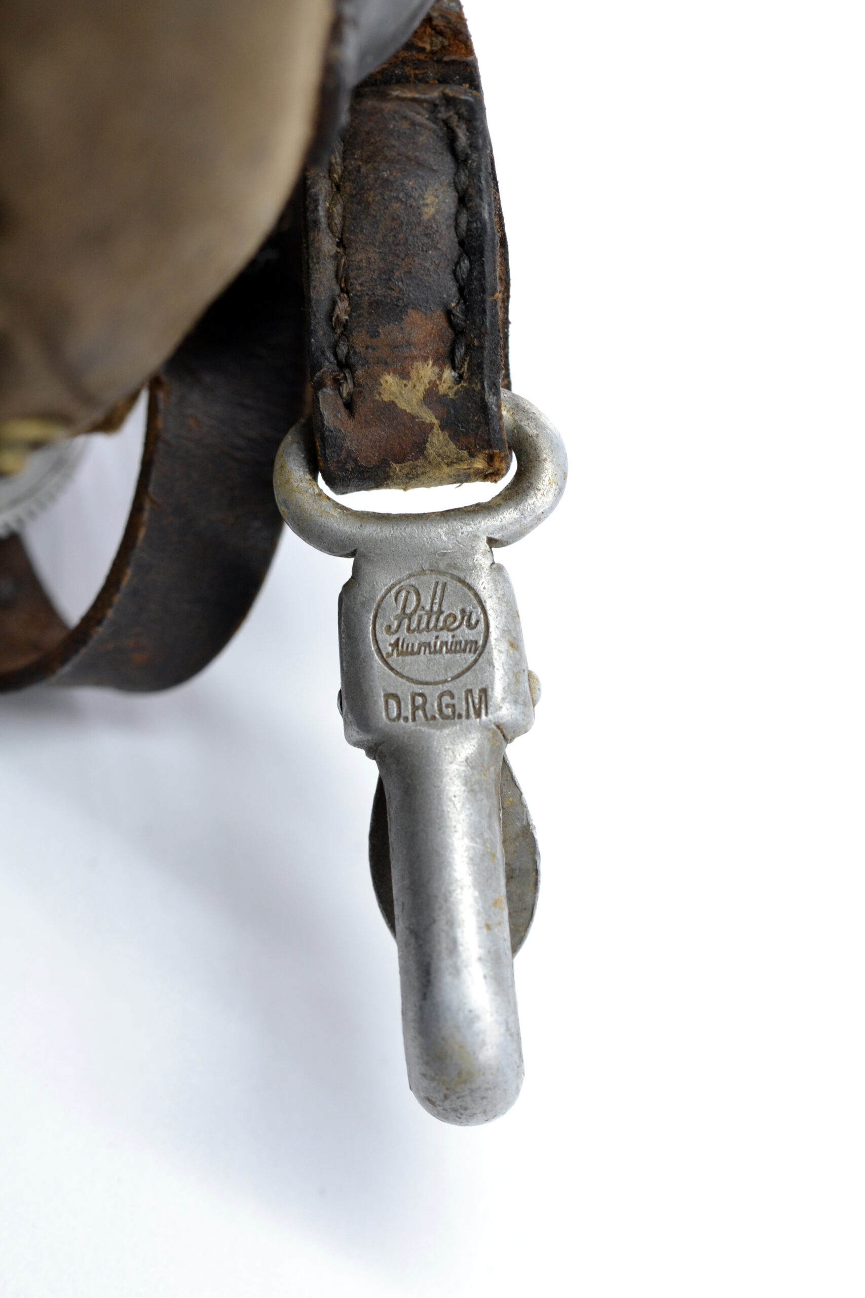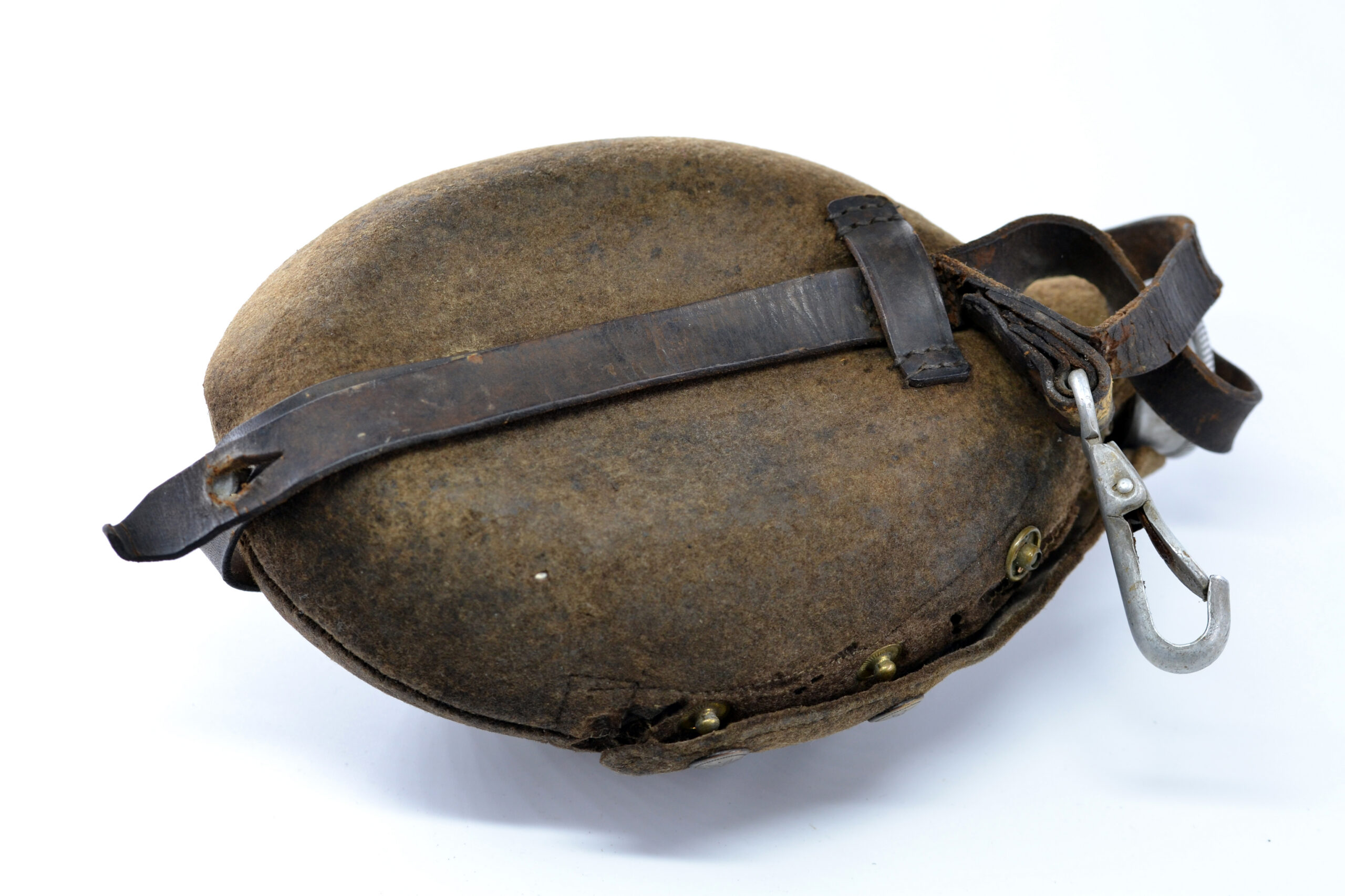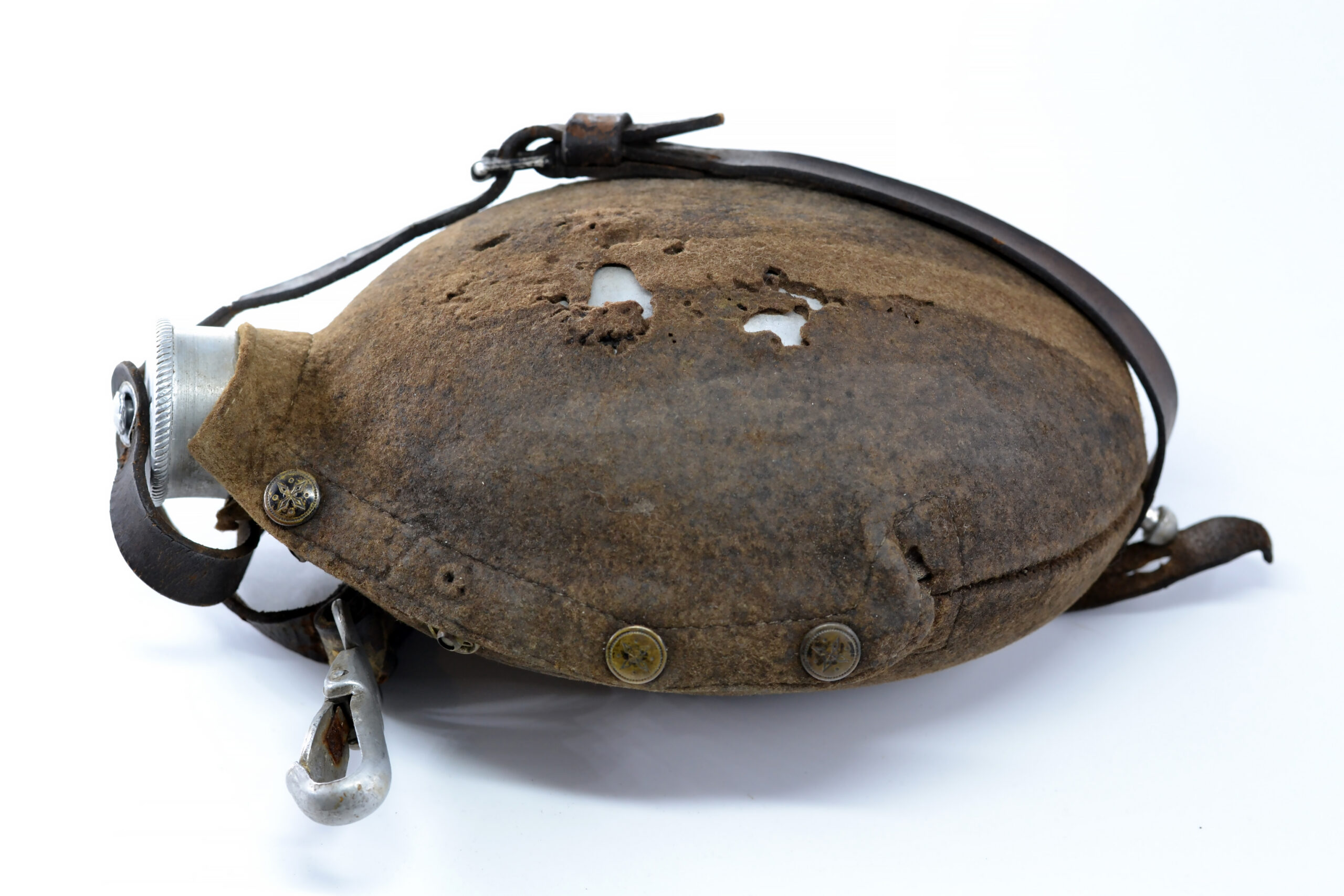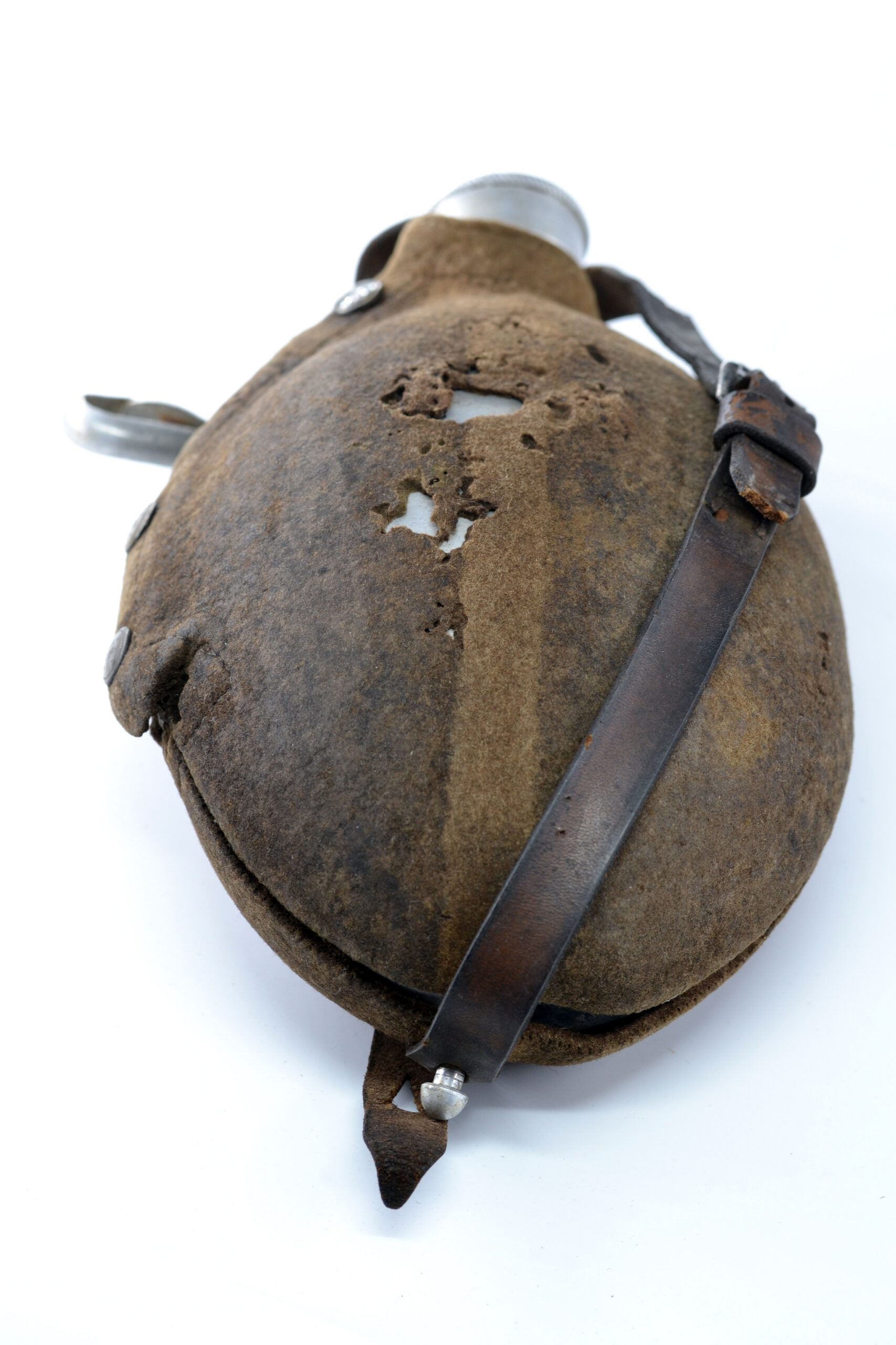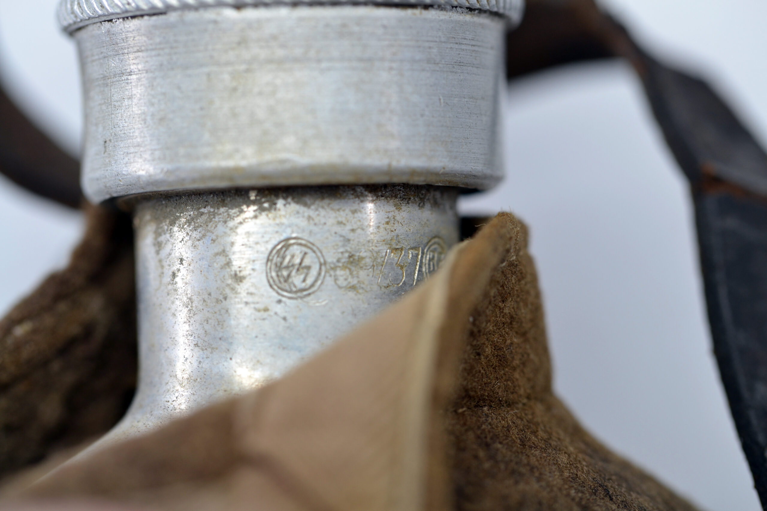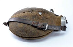 The cover and leather strap are both in salty condition, and the cover has been damaged, as can be seen on the pictures, but they are both original to the canteen. It was found in Germany.