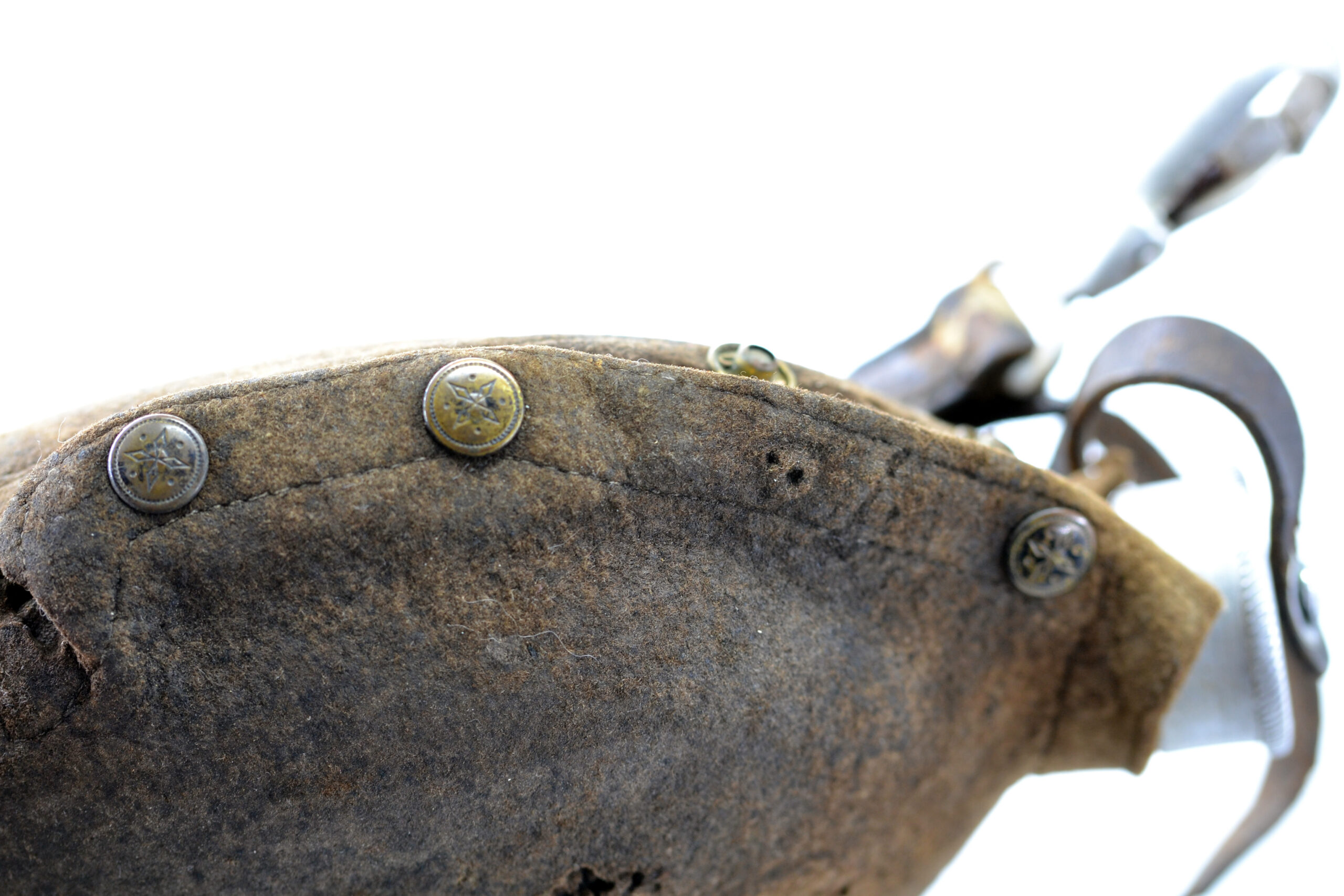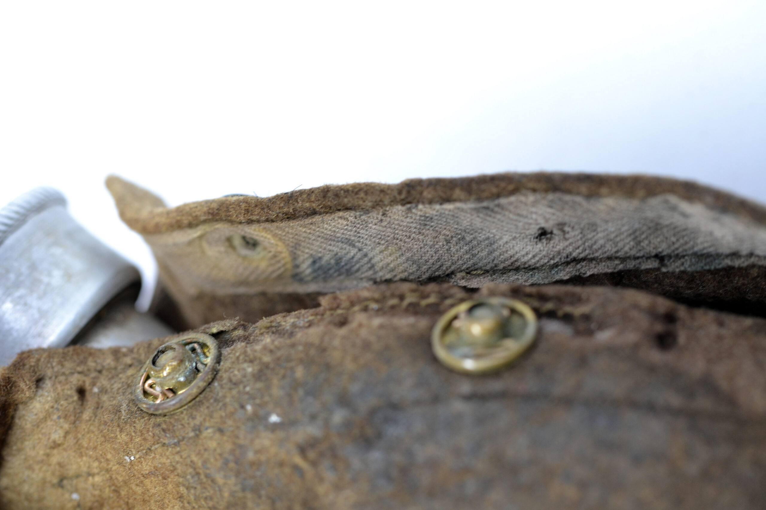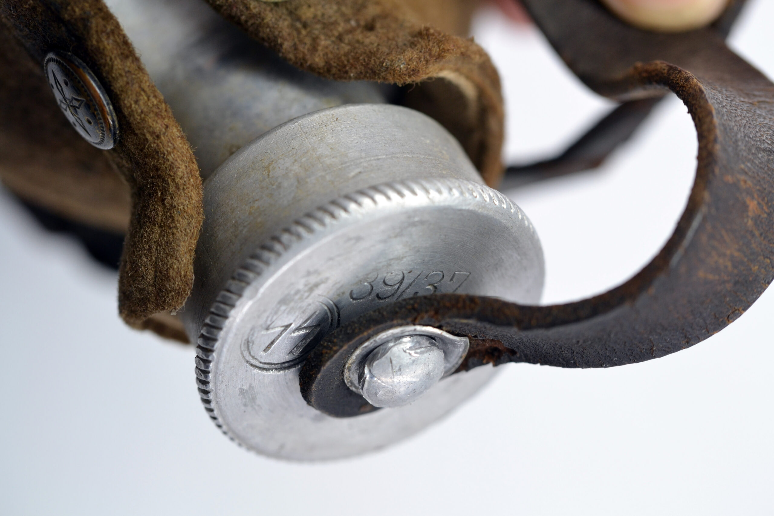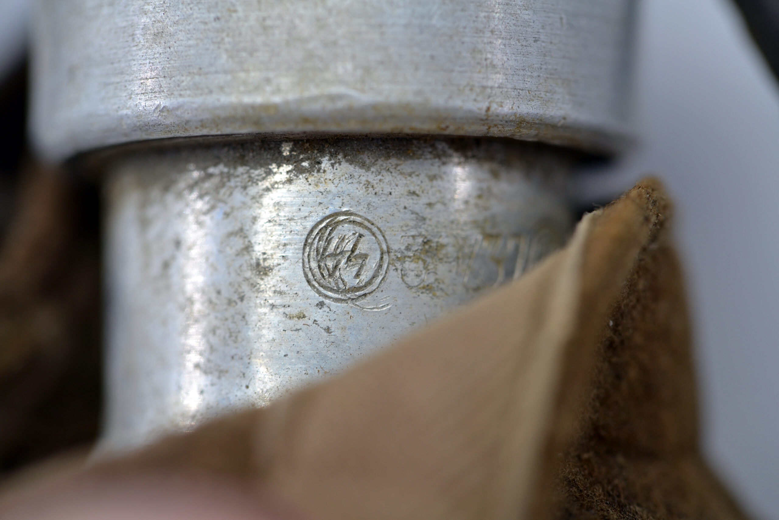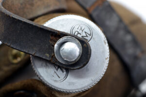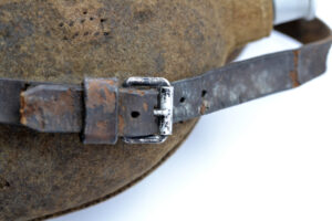 The cover and leather strap are both in salty condition, and the cover has been damaged, as can be seen on the pictures, but they are both original to the canteen. It was found in Germany.