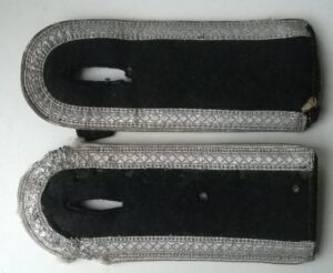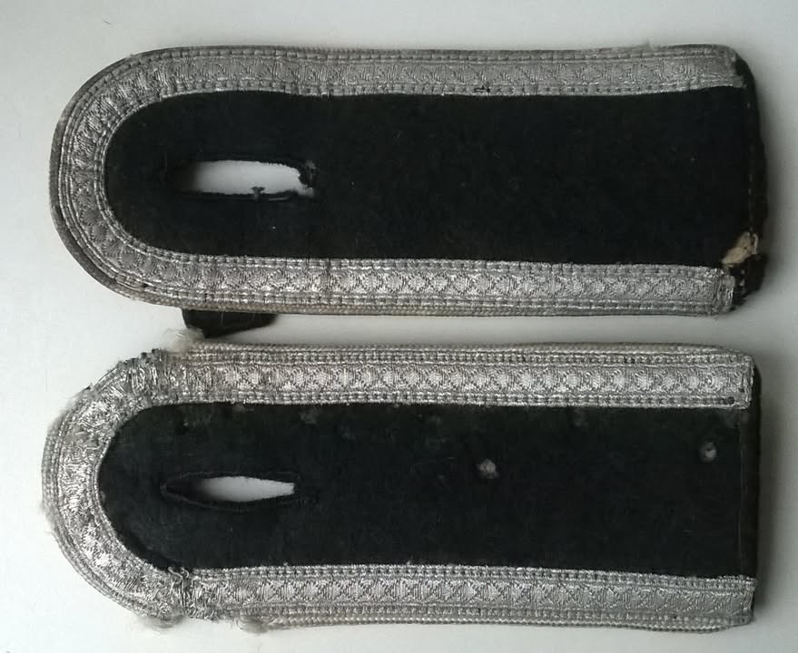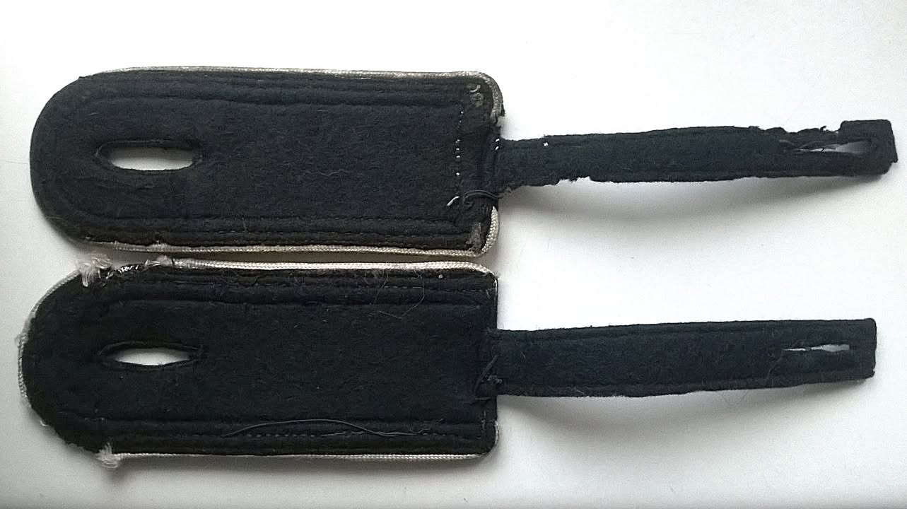 The boards are very well-made, but have a non-typical strap on the back, probably a field-made adjustment. The boards are big and seemingly made to be worn on a greatcoat. They are in worn condition with minor moth damage.